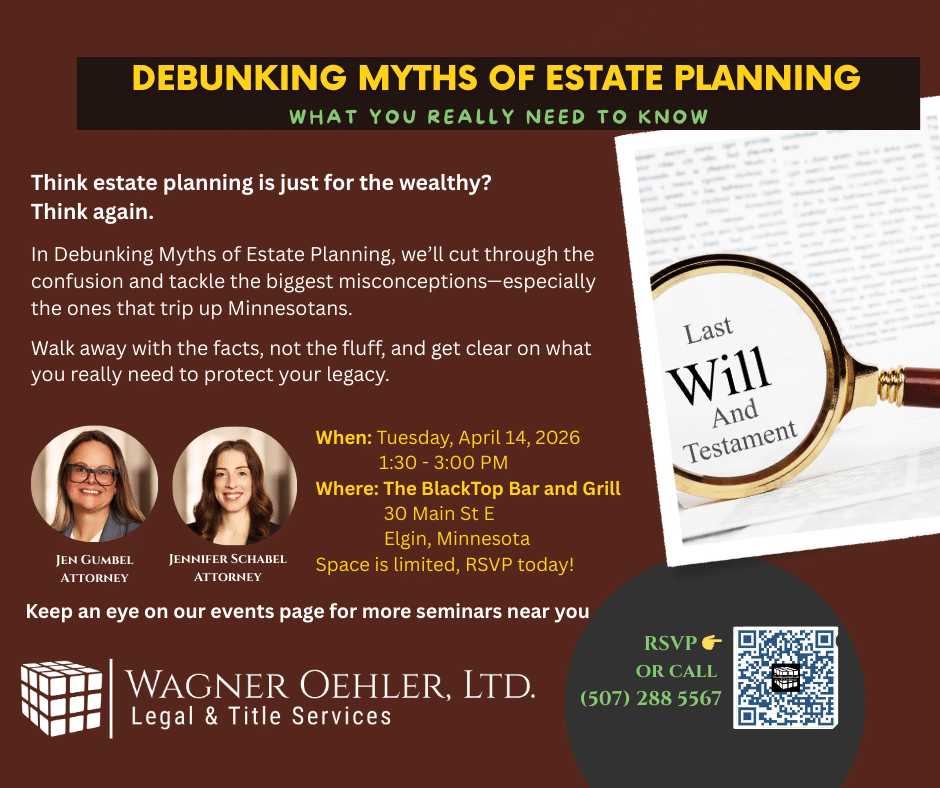 Join Wagner Oehler for a practical seminar on Minnesota estate planning. We’ll cover the real differences between wills and trusts, how to avoid common mistakes, and what families can do now to protect their assets, avoid probate problems, and make things easier on the people they love.