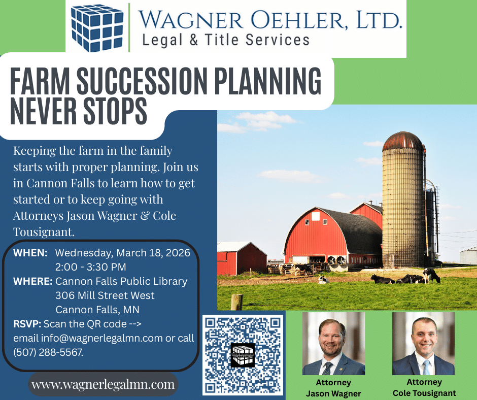 Secure Your Farm's Future: "Keeping the Farm in the Family"Join Attorneys Jason Wagner and Cole Tousignant for our third Farm Succession Planning seminar in Cannon Falls. Learn about the challenges farmers face when planning how and when to pass on the family farm. Over 50% of farmers see the lack of succession planning as their biggest challenge. Our attorneys work with farmers on a regular basis to help guide them on the steps to take, and the actions to avoid.