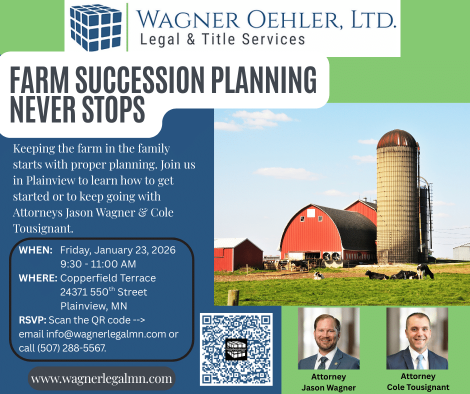 Secure Your Farm’s Future: "Keeping the Farm in the Family" ?Did you know that over 50% of farmers see the lack of succession planning as their biggest challenge? Don’t let your family farm’s future be uncertain. Join Attorneys Jason Wagner and Cole Tousignant, for a must-attend event packed with actionable insights.